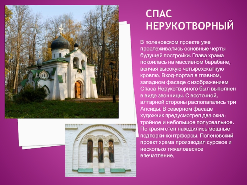 храма покоилась на массивном барабане, венчая высокую четырехскатную кровлю. Вход-портал в главном, западном фасаде с изображением Спаса Нерукотворного был выполнен в виде звонницы. С восточной, алтарной стороны располагались три Апсиды. В северном фасаде художник предусмотрел два окна: тройное и небольшое полуовальное. По краям стен находились мощные подпорки-контрфорсы. Поленовский проект храма производил суровое и несколько тяжеловесное впечатление.