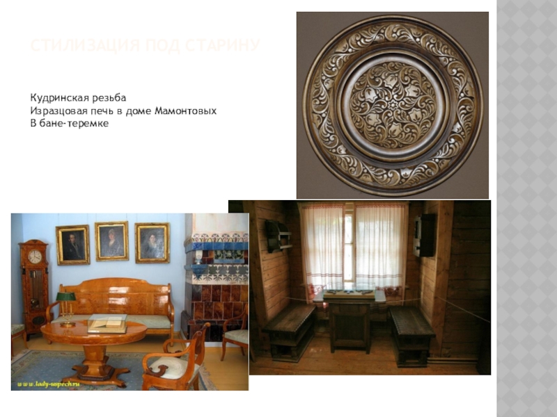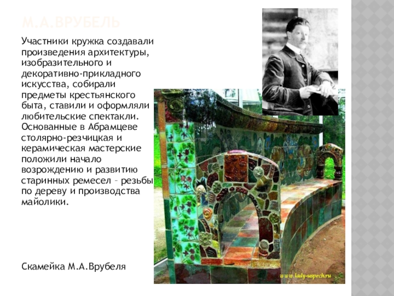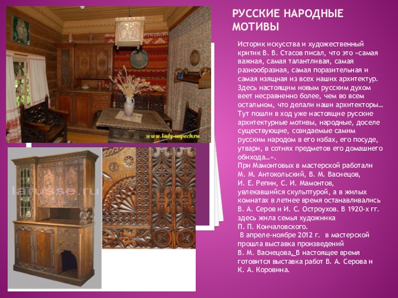 крестьянского быта, ставили и оформляли любительские спектакли. Основанные в Абрамцеве столярно-резчицкая и керамическая мастерские положили начало возрождению и развитию старинных ремесел – резьбы по дереву и производства майолики.