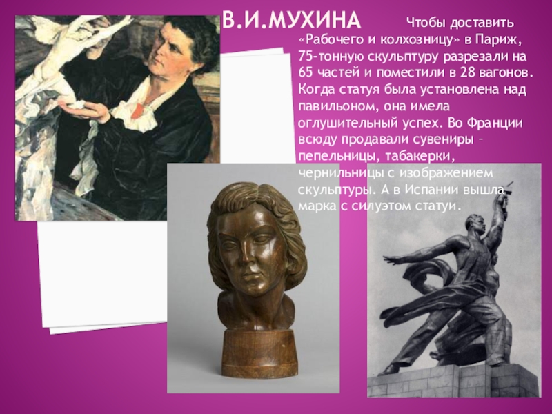 Чтобы доставить «Рабочего и колхозницу» в Париж, 75-тонную скульптуру разрезали на 65 частей и поместили в 28 вагонов. Когда статуя была установлена над павильоном, она имела оглушительный успех. Во Франции всюду продавали сувениры – пепельницы, табакерки, чернильницы с изображением скульптуры. А в Испании вышла марка с силуэтом статуи.