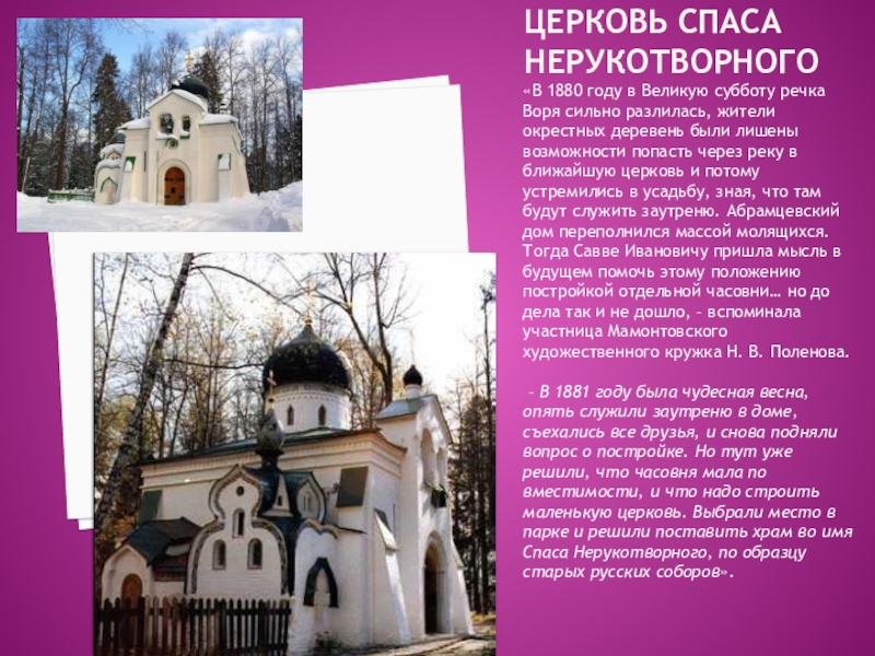 – В 1881 году была чудесная весна, опять служили заутреню в доме, съехались все друзья, и снова подняли вопрос о постройке. Но тут уже решили, что часовня мала по вместимости, и что надо строить маленькую церковь. Выбрали место в парке и решили поставить храм во имя Спаса Нерукотворного, по образцу старых русских соборов».
