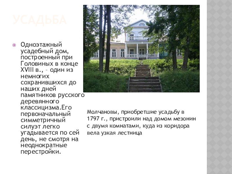 Молчановы, приобретшие усадьбу в 1797 г., пристроили над домом мезонин с двумя комнатами, куда из коридора вела узкая лестница