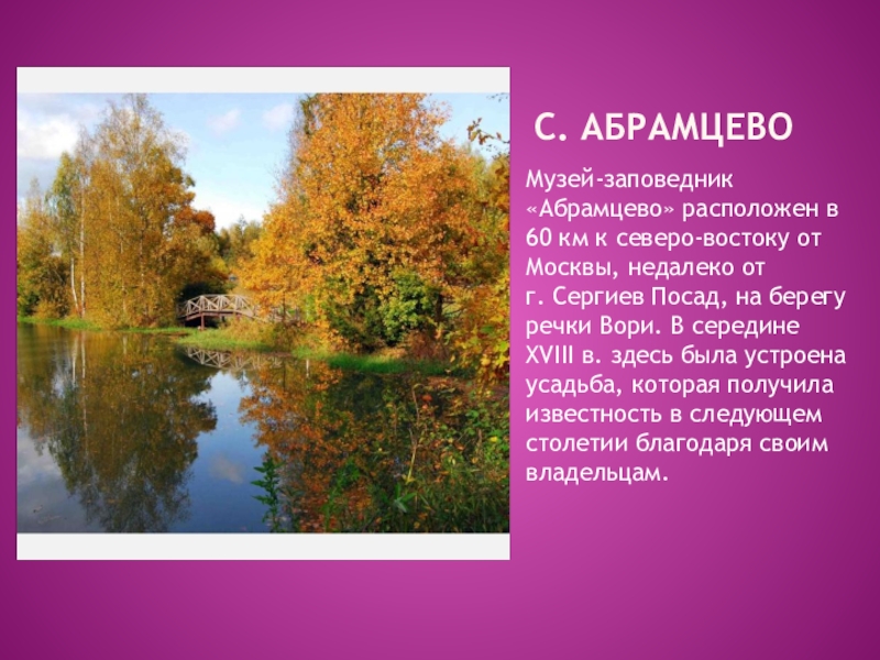 Музей-заповедник «Абрамцево» расположен в 60 км к северо-востоку от Москвы,