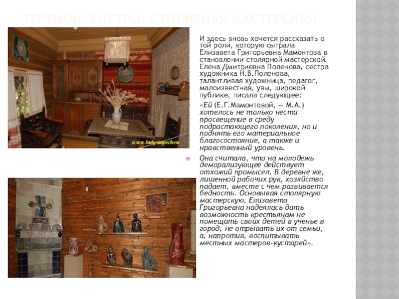 которую сыграла Елизавета Григорьевна Мамонтова в становлении столярной мастерской. Елена Дмитриевна Поленова, сестра художника Н.В.Поленова, талантливая художница, педагог, малоизвестная, увы, широкой публике, писала следующее:
