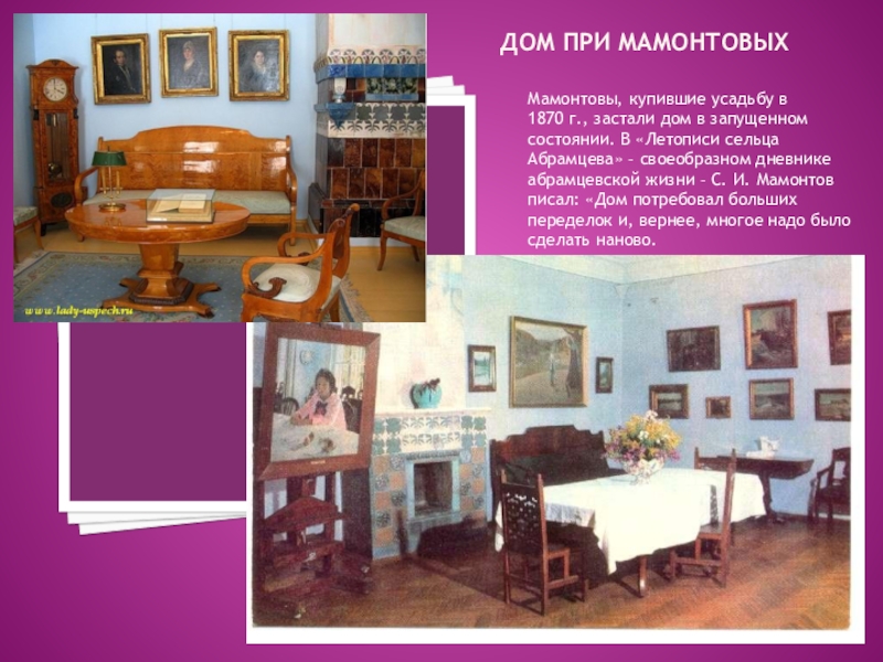 состоянии. В «Летописи сельца Абрамцева» – своеобразном дневнике абрамцевской жизни – С. И. Мамонтов писал: «Дом потребовал больших переделок и, вернее, многое надо было сделать наново.