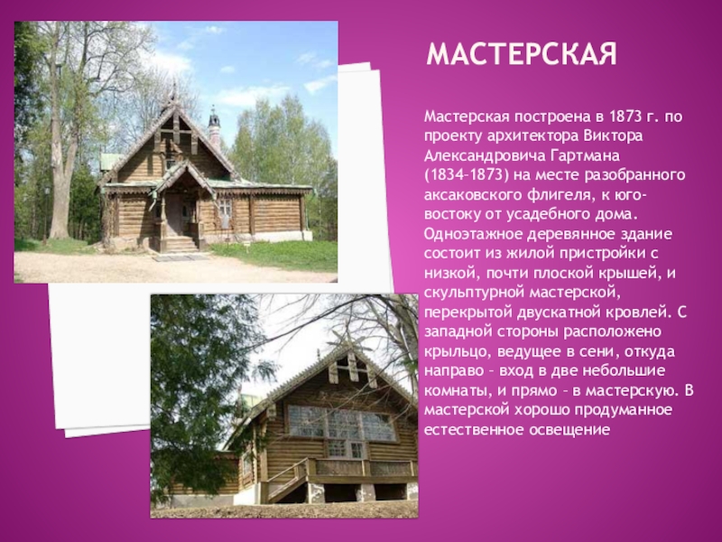 архитектора Ивана Павловича Ропета (настоящие имя и фамилия Иван Николаевич Петров, 1844–1908). Прежде, при Аксакове, здесь располагалась баня, и новая постройка первое время использовалась в этом же качестве. Потом — как помещение для гостей. Сейчас в этом здании размещаются изделия абрамцевской столярно-резчицкой мастерской, изготовленные по эскизам Елены Дмитриевны Поленовой и других художников.