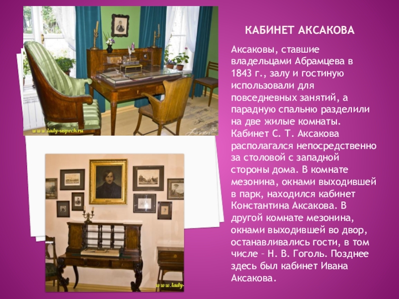 для повседневных занятий, а парадную спальню разделили на две жилые комнаты. Кабинет С. Т. Аксакова располагался непосредственно за столовой с западной стороны дома. В комнате мезонина, окнами выходившей в парк, находился кабинет Константина Аксакова. В другой комнате мезонина, окнами выходившей во двор, останавливались гости, в том числе – Н. В. Гоголь. Позднее здесь был кабинет Ивана Аксакова.