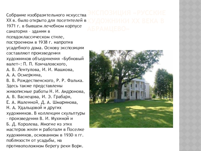 Слайд 23Экспозиция «русские художники ХХ века в абрамцево»