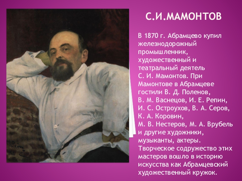 театральный деятель С. И. Мамонтов. При Мамонтове в Абрамцеве гостили В. Д. Поленов, В. М. Васнецов, И. Е. Репин, И. С. Остроухов, В. А. Серов, К. А. Коровин, М. В. Нестеров, М. А. Врубель и другие художники, музыканты, актеры. Творческое содружество этих мастеров вошло в историю искусства как Абрамцевский художественный кружок.