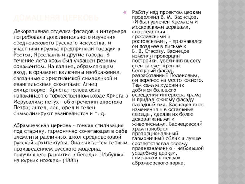 Абрамцевская церковь – тонкая стилизация под старину, гармонично сочетающая в себе элементы различных школ средневековой русской архитектуры. Она считается первым произведением русского модерна, получившего развитие в беседке «Избушка на курьих ножках» (1883)