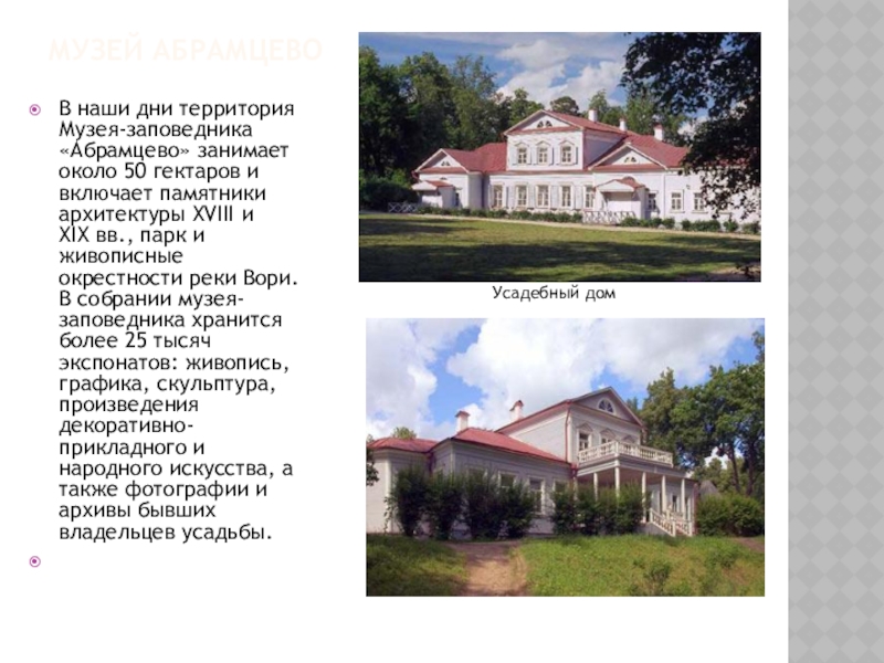 В наши дни территория Музея-заповедника «Абрамцево» занимает около 50 гектаров и включает памятники архитектуры XVIII и XIX вв., парк и живописные окрестности реки Вори. В собрании музея-заповедника хранится более 25 тысяч экспонатов: живопись, графика, скульптура, произведения декоративно-прикладного и народного искусства, а также фотографии и архивы бывших владельцев усадьбы.