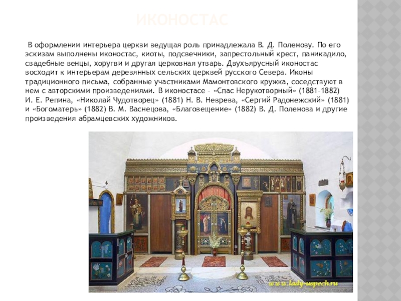 эскизам выполнены иконостас, киоты, подсвечники, запрестольный крест, паникадило, свадебные венцы, хоругви и другая церковная утварь. Двухъярусный иконостас восходит к интерьерам деревянных сельских церквей русского Севера. Иконы традиционного письма, собранные участниками Мамонтовского кружка, соседствуют в нем с авторскими произведениями. В иконостасе – «Спас Нерукотворный» (1881–1882) И. Е. Репина, «Николай Чудотворец» (1881) Н. В. Неврева, «Сергий Радонежский» (1881) и «Богоматерь» (1882) В. М. Васнецова, «Благовещение» (1882) В. Д. Поленова и другие произведения абрамцевских художников.