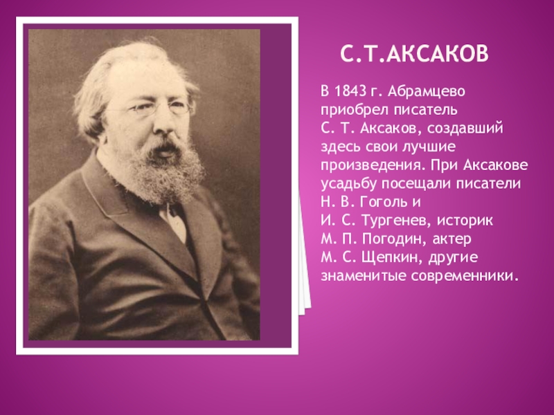 В 1843 г. Абрамцево приобрел писатель С. Т. Аксаков, создавший здесь свои лучшие