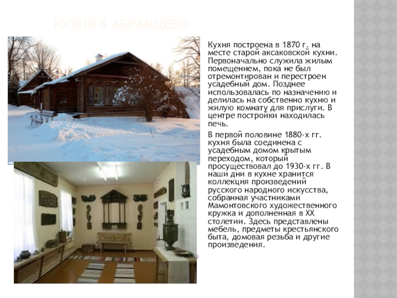 В первой половине 1880-х гг. кухня была соединена с усадебным домом крытым переходом, который просуществовал до 1930-х гг. В наши дни в кухне хранится коллекция произведений русского народного искусства, собранная участниками Мамонтовского художественного кружка и дополненная в XX столетии. Здесь представлены мебель, предметы крестьянского быта, домовая резьба и другие произведения.