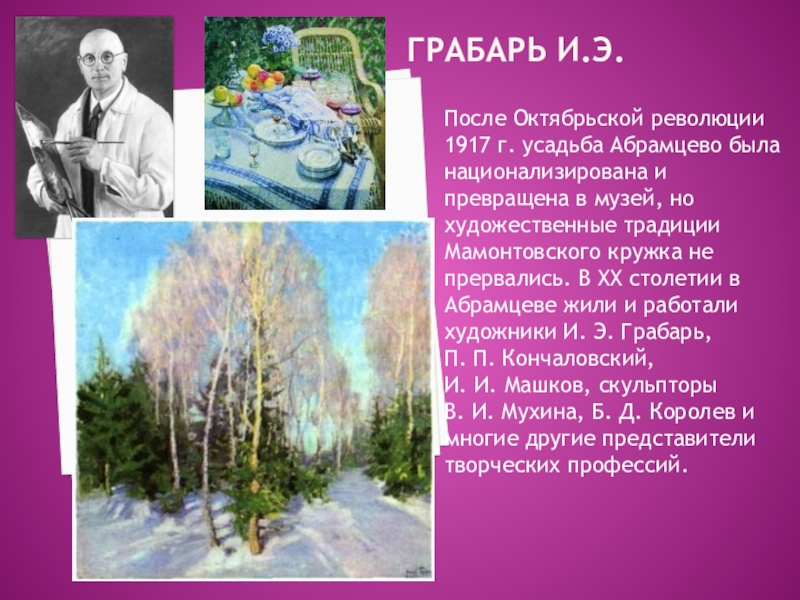 национализирована и превращена в музей, но художественные традиции Мамонтовского кружка не прервались. В XX столетии в Абрамцеве жили и работали художники И. Э. Грабарь, П. П. Кончаловский, И. И. Машков, скульпторы В. И. Мухина, Б. Д. Королев и многие другие представители творческих профессий.