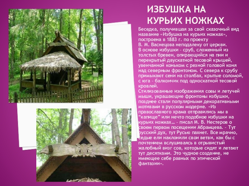 на курьих ножках», построена в 1883 г. по проекту В. М. Васнецова неподалеку от церкви.