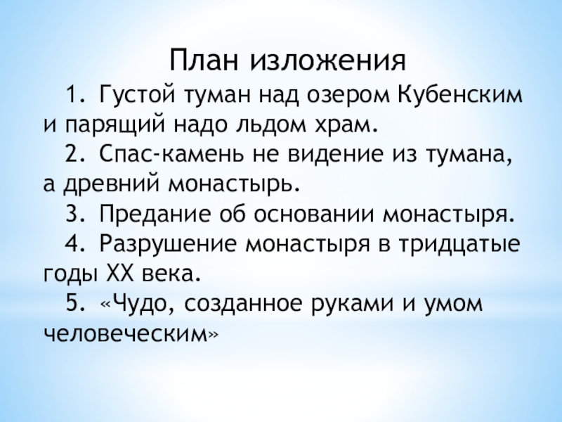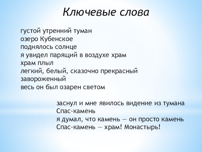 Слайд 13Густой утренний туман пал на озеро Кубенское. Не видать берегов, не