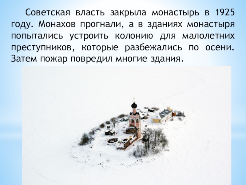 Слайд 8Советская власть закрыла монастырь в 1925 году. Монахов прогнали, а в