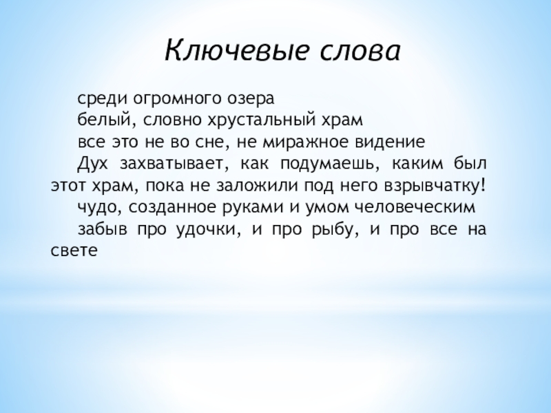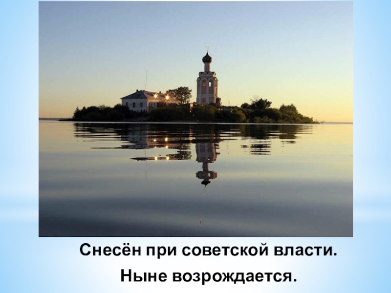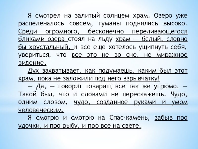 Слайд 17Я смотрел на залитый солнцем храм. Озеро уже распеленалось совсем, туманы
