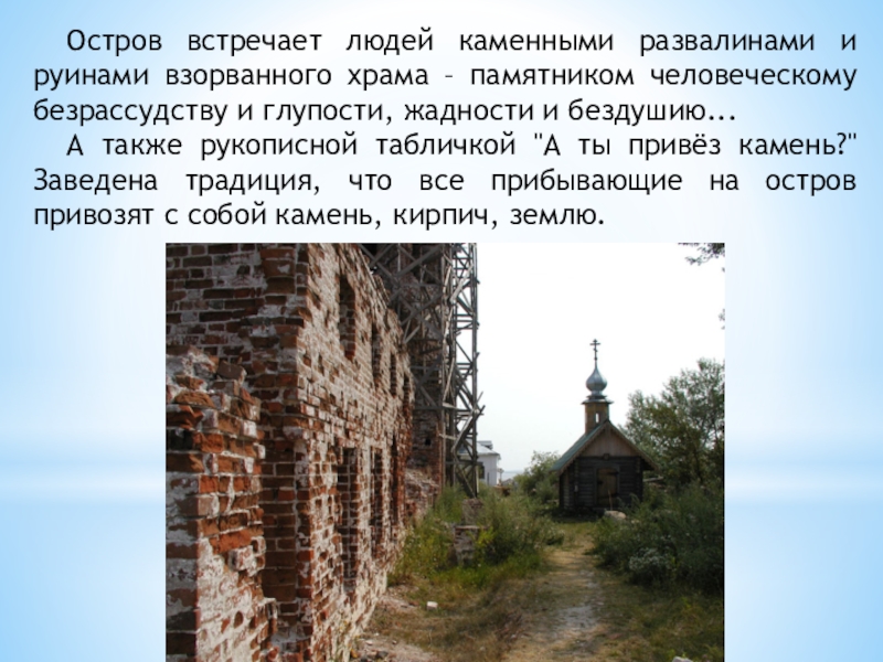 Слайд 11Остров встречает людей каменными развалинами и руинами взорванного храма – памятником