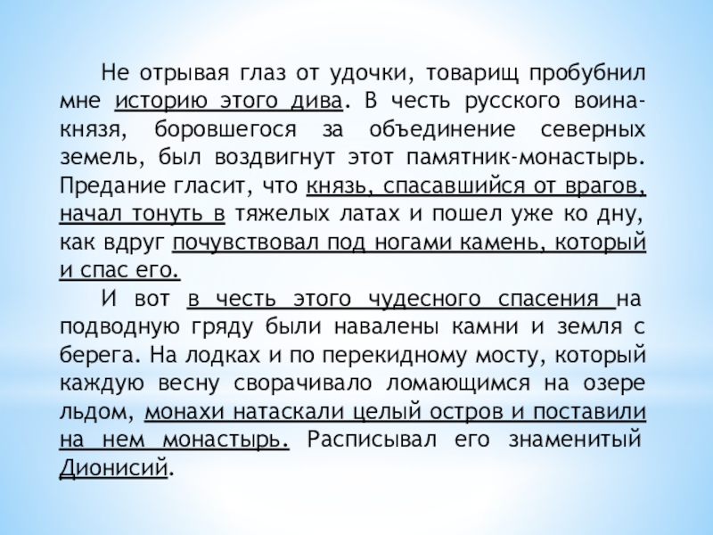 И вот в честь этого чудесного спасения на подводную гряду были навалены камни и земля с берега. На лодках и по перекидному мосту, который каждую весну сворачивало ломающимся на озере льдом, монахи натаскали целый остров и поставили на нем монастырь. Расписывал его знаменитый Дионисий.
