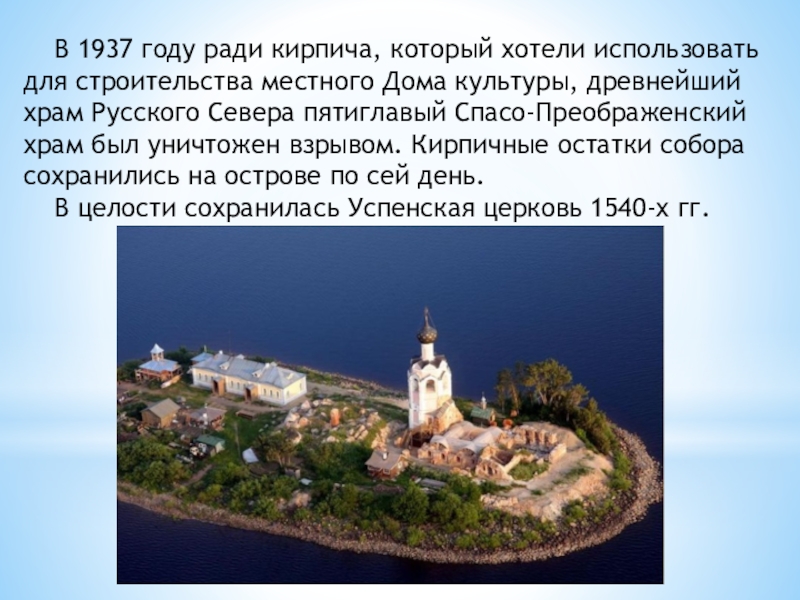 Дома культуры, древнейший храм Русского Севера пятиглавый Спасо-Преображенский храм был уничтожен взрывом. Кирпичные остатки собора сохранились на острове по сей день.