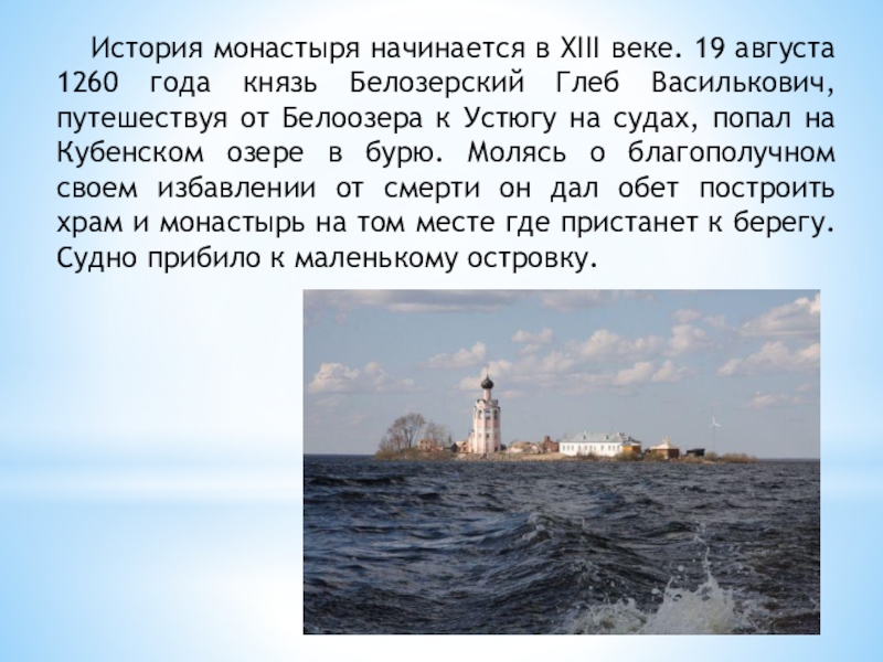 Белозерский Глеб Василькович, путешествуя от Белоозера к Устюгу на судах, попал на Кубенском озере в бурю. Молясь о благополучном своем избавлении от смерти он дал обет построить храм и монастырь на том месте где пристанет к берегу. Судно прибило к маленькому островку.