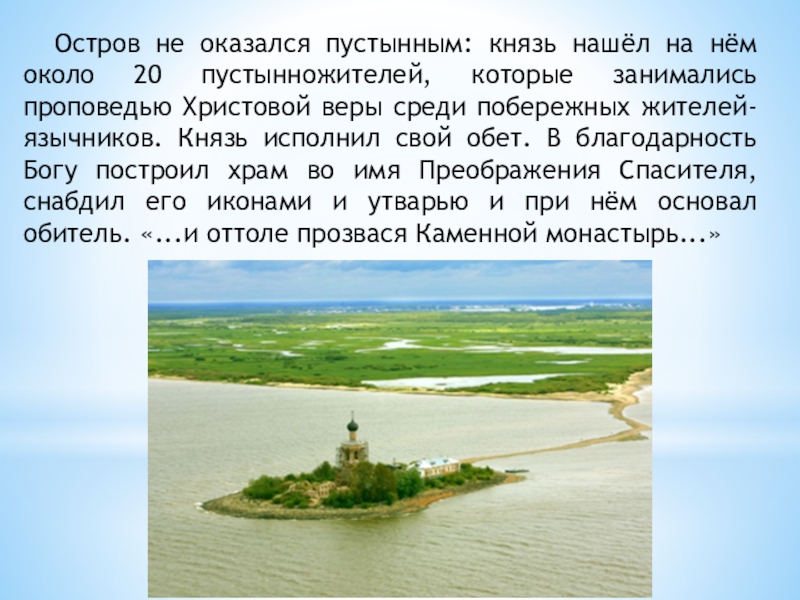 Слайд 6Остров не оказался пустынным: князь нашёл на нём около 20 пустынножителей,