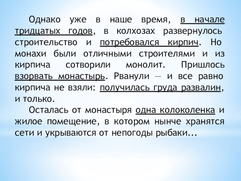 развернулось строительство и потребовался кирпич. Но монахи были отличными строителями и из кирпича сотворили монолит. Пришлось взорвать монастырь. Рванули — и все равно кирпича не взяли: получилась груда развалин, и только.