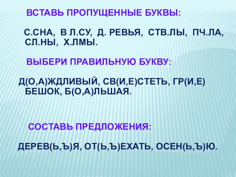 ДЕРЕВ(Ь,Ъ)Я, ОТ(Ь,Ъ)ЕХАТЬ, ОСЕН(Ь,Ъ)Ю.
