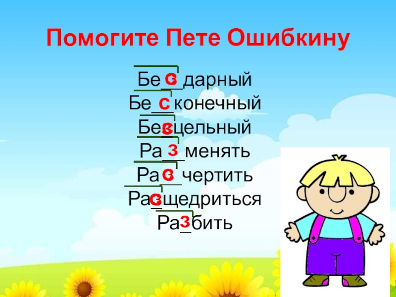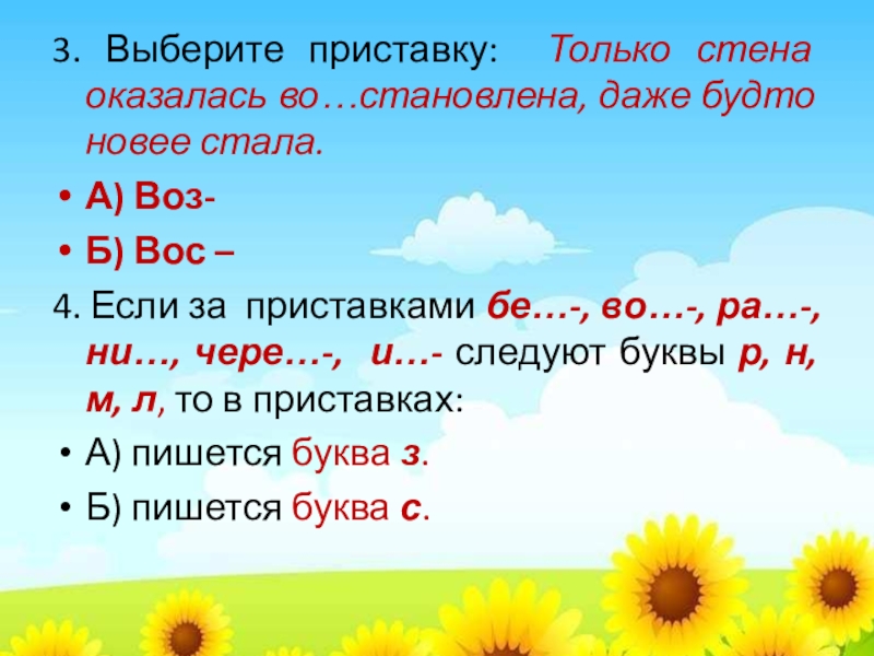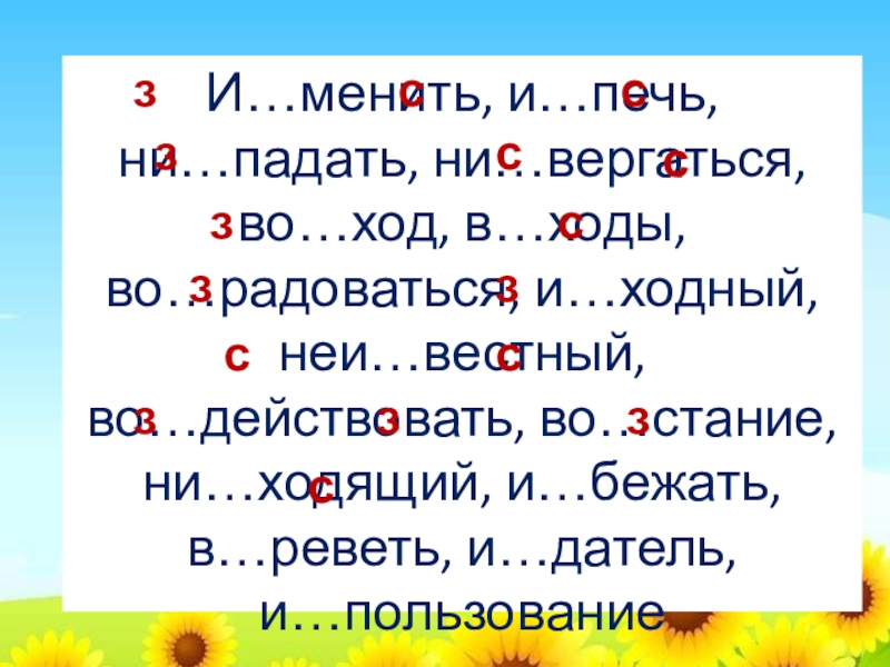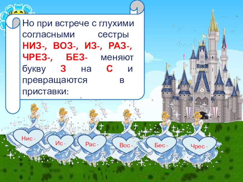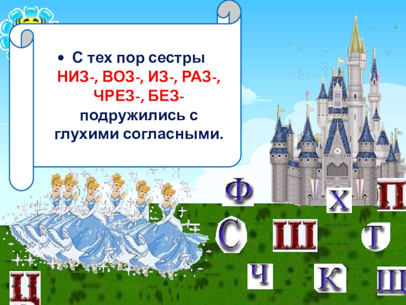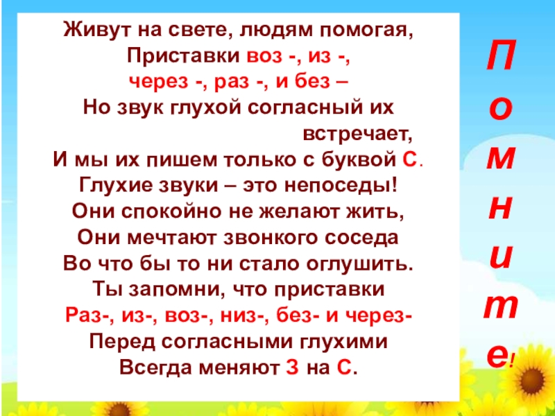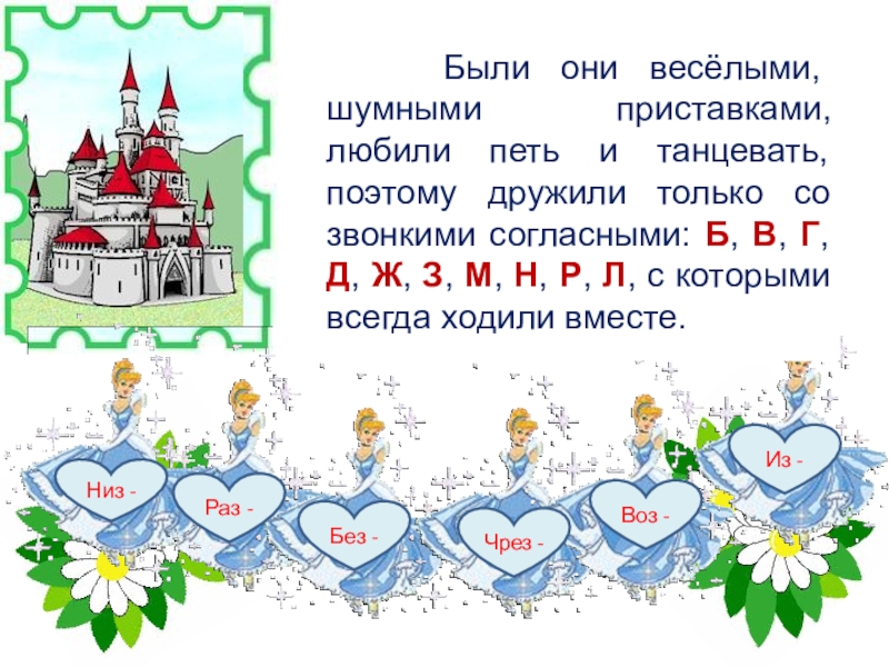 Были они весёлыми, шумными приставками, любили петь и танцевать, поэтому дружили только со звонкими согласными: Б, В, Г, Д, Ж, З, М, Н, Р, Л, с которыми всегда ходили вместе.