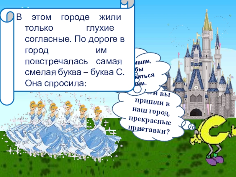 В этом городе жили только глухие согласные. По дороге в город им повстречалась самая смелая буква – буква С. Она спросила: