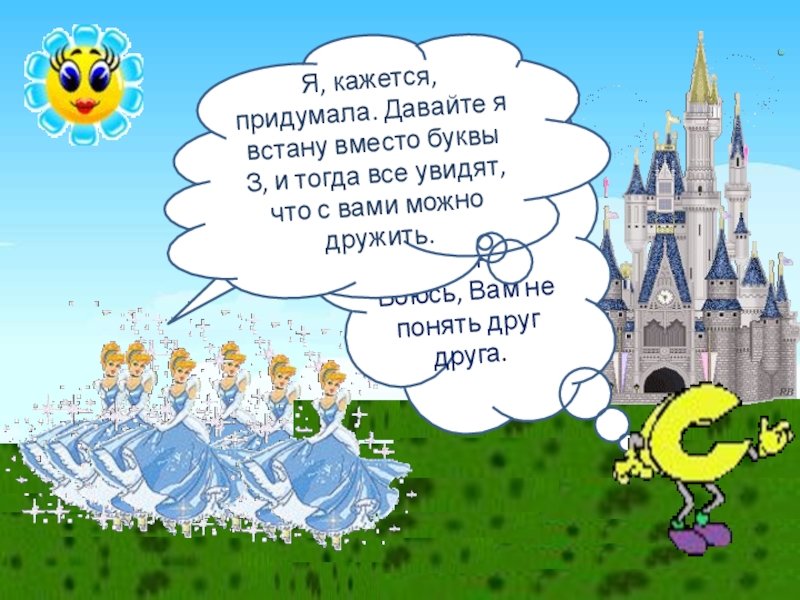 Я, кажется, придумала. Давайте я встану вместо буквы З, и тогда все увидят, что с вами можно дружить.