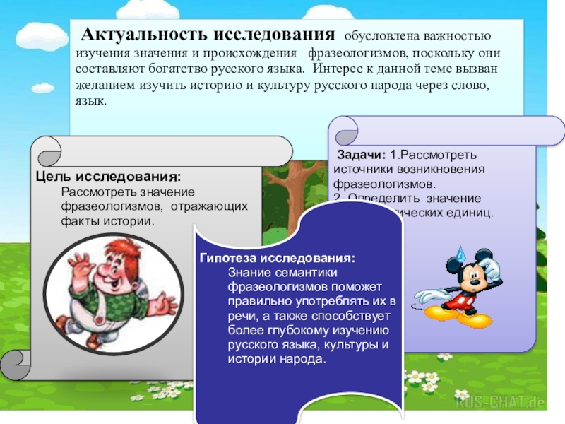 Гипотеза исследования: Знание семантики фразеологизмов поможет правильно употреблять их в речи, а также способствует более глубокому изучению русского языка, культуры и истории народа.