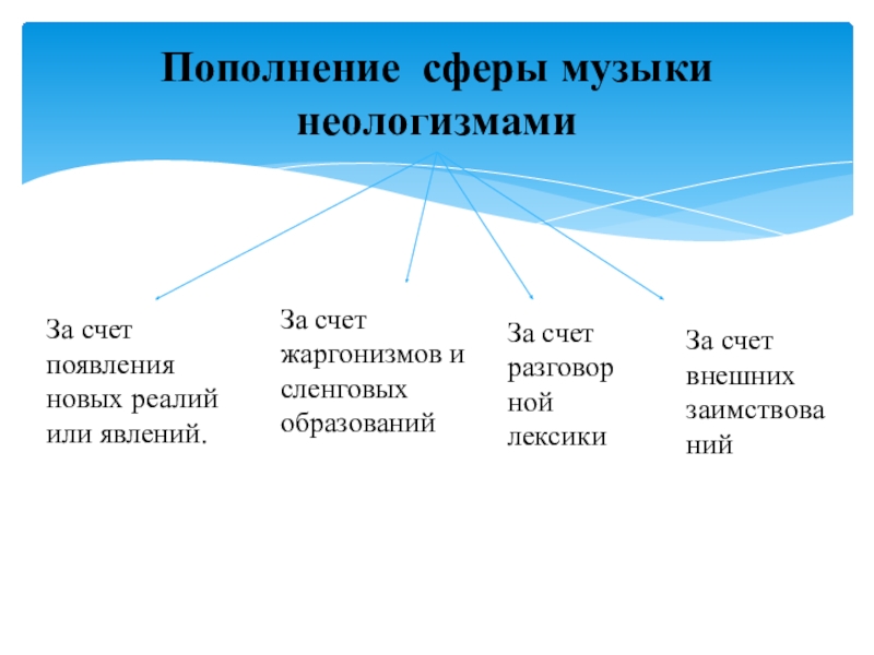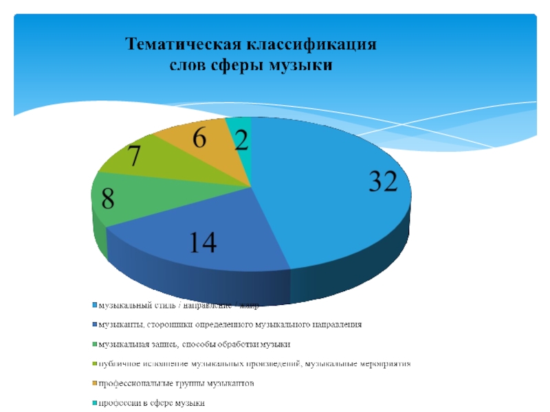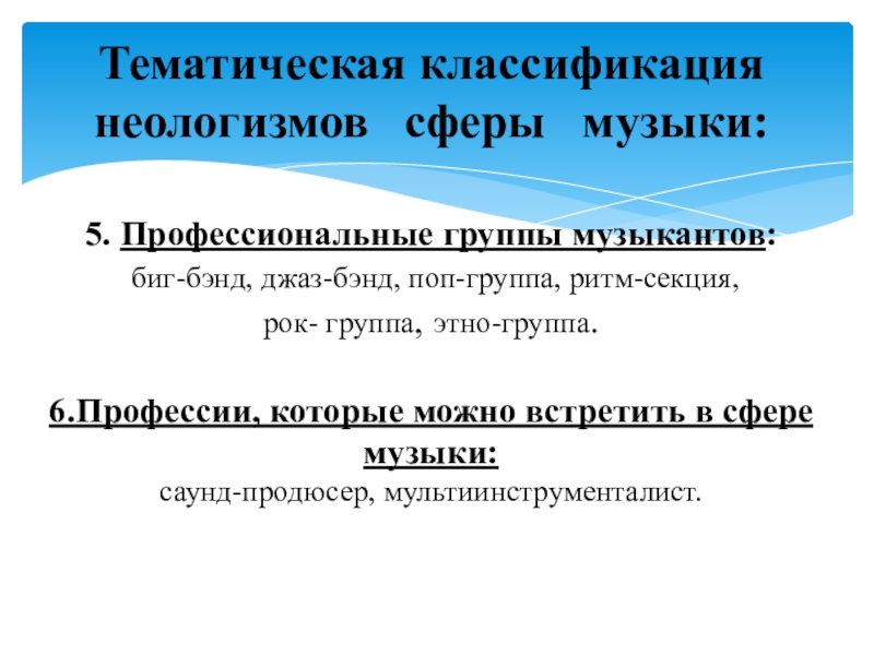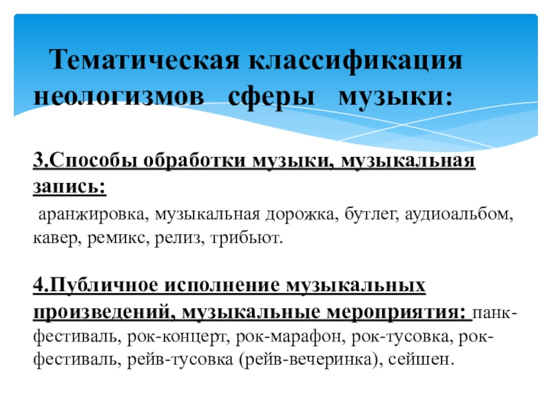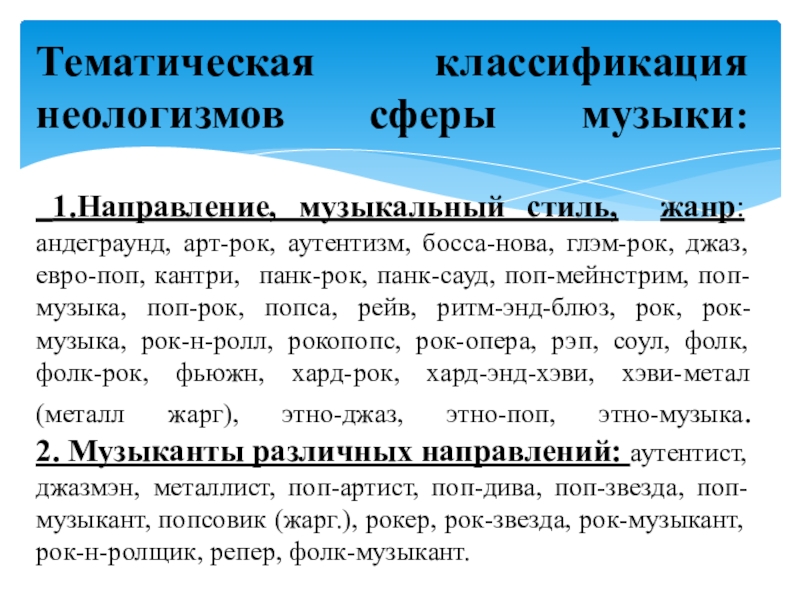 Слайд 14Тематическая классификация неологизмов сферы музыки: