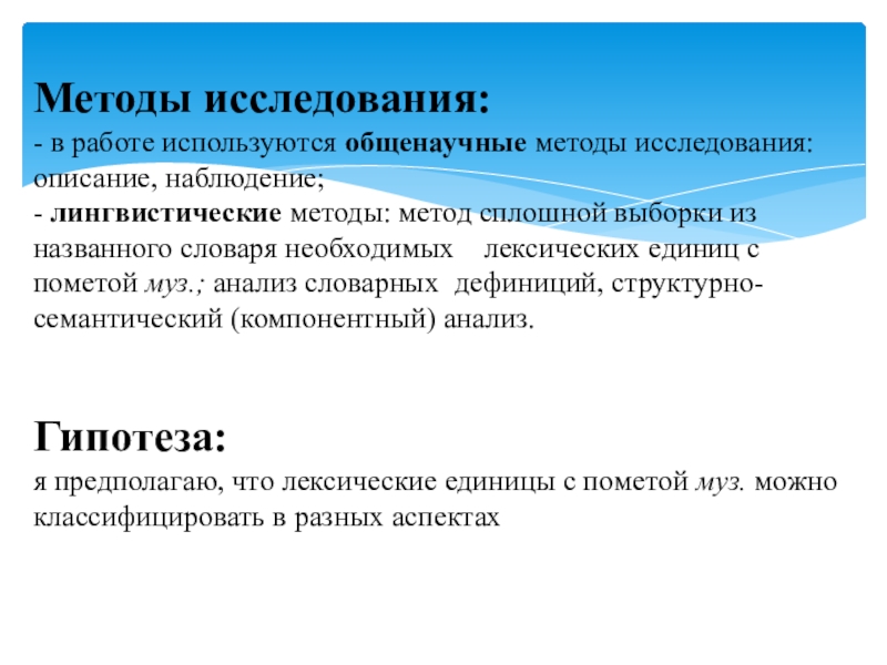 лингвистические методы: метод сплошной выборки из названного словаря необходимых лексических единиц c пометой муз.; анализ словарных дефиниций, структурно-семантический (компонентный) анализ.