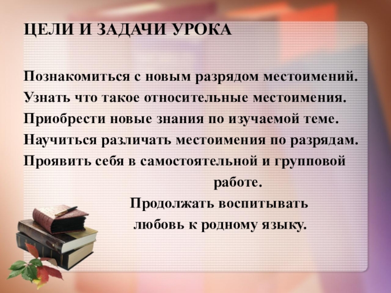 ЦЕЛИ И ЗАДАЧИ УРОКАПознакомиться с новым разрядом местоимений.Узнать что такое относительные местоимения.Приобрести новые знания по изучаемой теме.Научиться