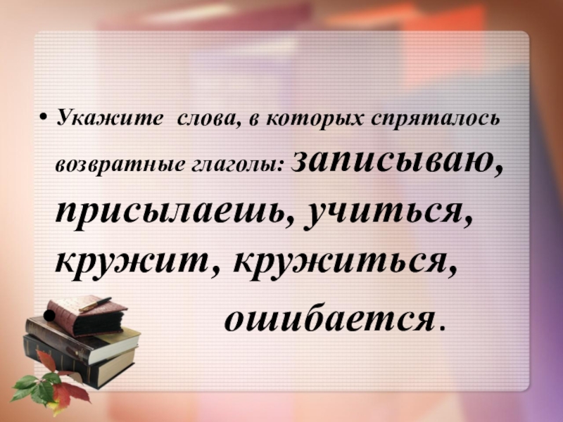 Укажите слова, в которых спряталось возвратные глаголы: записываю, присылаешь, учиться, кружит,