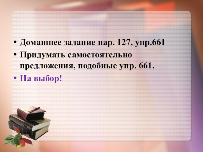 Домашнее задание пар. 127, упр.661Придумать самостоятельно предложения, подобные упр. 661.На выбор!