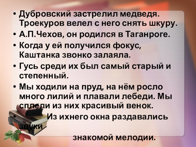Дубровский застрелил медведя. Троекуров велел с него снять шкуру. А.П.Чехов, он родился в Таганроге. Когда у ей