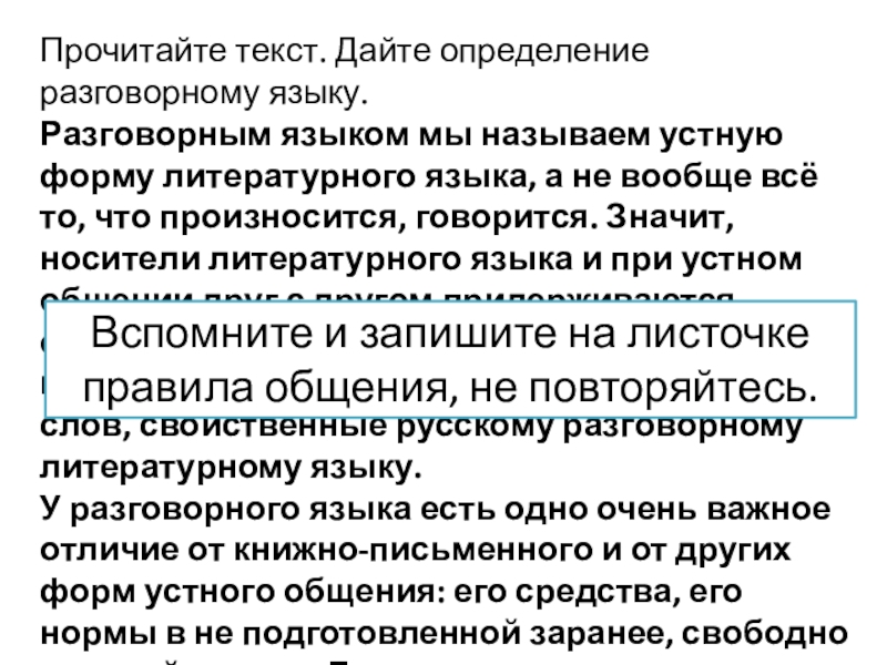 литературного языка, а не вообще всё то, что произносится, говорится. Значит, носители литературного языка и при устном общении друг с другом придерживаются определённых правил речи. Существуют нормы произношения, ударения, употребления слов, свойственные русскому разговорному литературному языку.