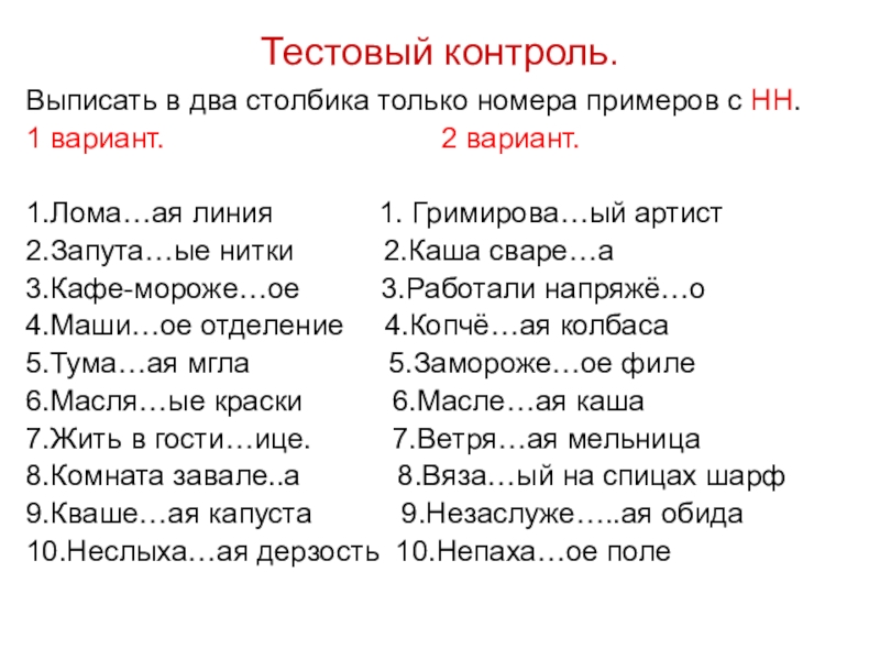 Выписать в два столбика только номера примеров с НН.