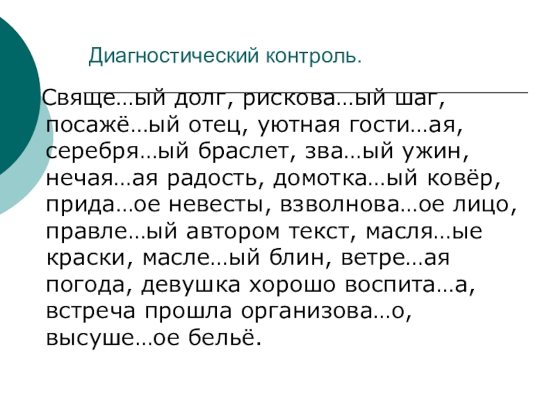 браслет, зва…ый ужин, нечая…ая радость, домотка…ый ковёр, прида…ое невесты, взволнова…ое лицо, правле…ый автором текст, масля…ые краски, масле…ый блин, ветре…ая погода, девушка хорошо воспита…а, встреча прошла организова…о, высуше…ое бельё.