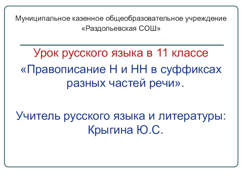 Учитель русского языка и литературы: Крыгина Ю.С.
