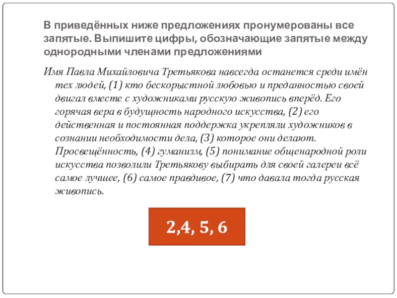 Имя Павла Михайловича Третьякова навсегда останется среди имён тех людей, (1) кто бескорыстной любовью и преданностью своей двигал вместе с художниками русскую живопись вперёд. Его горячая вера в будущность народного искусства, (2) его действенная и постоянная поддержка укрепляли художников в сознании необходимости дела, (3) которое они делают. Просвещённость, (4) гуманизм, (5) понимание общенародной роли искусства позволили Третьякову выбирать для своей галереи всё самое лучшее, (6) самое правдивое, (7) что давала тогда русская живопись.