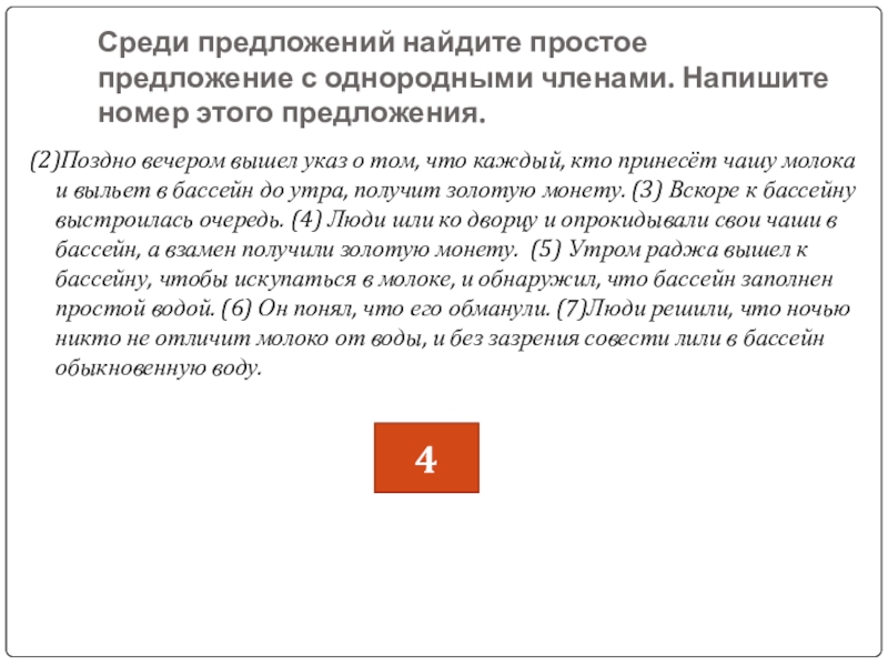 (2)Поздно вечером вышел указ о том, что каждый, кто принесёт чашу молока и выльет в бассейн до утра, получит золотую монету. (3) Вскоре к бассейну выстроилась очередь. (4) Люди шли ко дворцу и опрокидывали свои чаши в бассейн, а взамен получили золотую монету. (5) Утром раджа вышел к бассейну, чтобы искупаться в молоке, и обнаружил, что бассейн заполнен простой водой. (6) Он понял, что его обманули. (7)Люди решили, что ночью никто не отличит молоко от воды, и без зазрения совести лили в бассейн обыкновенную воду.