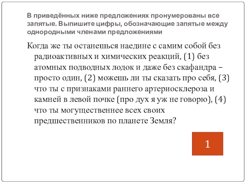 Когда же ты останешься наедине с самим собой без радиоактивных и химических реакций, (1) без атомных подводных лодок и даже без скафандра – просто один, (2) можешь ли ты сказать про себя, (3) что ты с признаками раннего артериосклероза и камней в левой почке (про дух я уж не говорю), (4) что ты могущественнее всех своих предшественников по планете Земля?