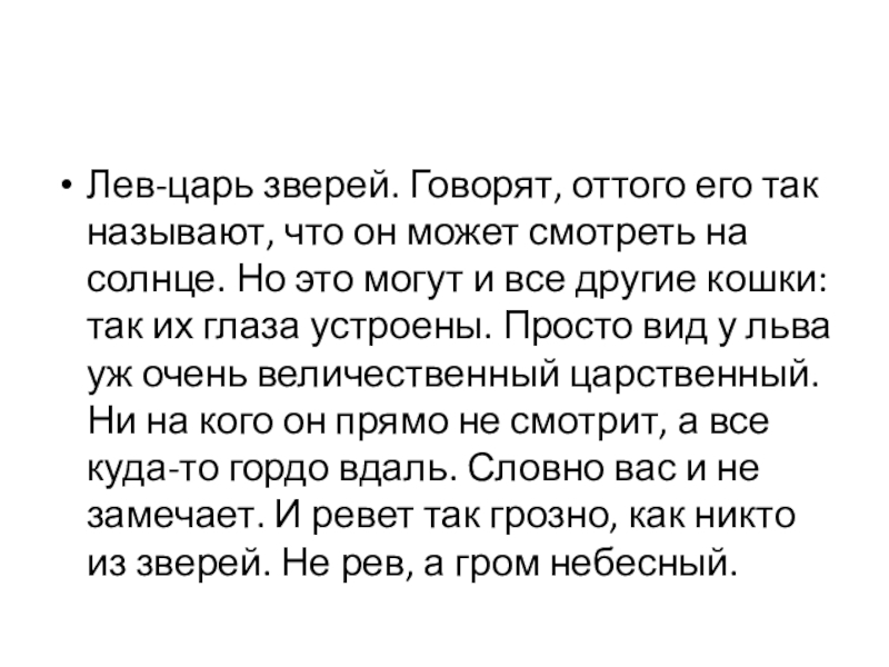 на солнце. Но это могут и все другие кошки: так их глаза устроены. Просто вид у льва уж очень величественный царственный. Ни на кого он прямо не смотрит, а все куда-то гордо вдаль. Словно вас и не замечает. И ревет так грозно, как никто из зверей. Не рев, а гром небесный.