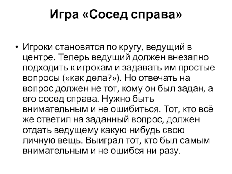 должен внезапно подходить к игрокам и задавать им простые вопросы («как дела?»). Но отвечать на вопрос должен не тот, кому он был задан, а его сосед справа. Нужно быть внимательным и не ошибиться. Тот, кто всё же ответил на заданный вопрос, должен отдать ведущему какую-нибудь свою личную вещь. Выиграл тот, кто был самым внимательным и не ошибся ни разу.