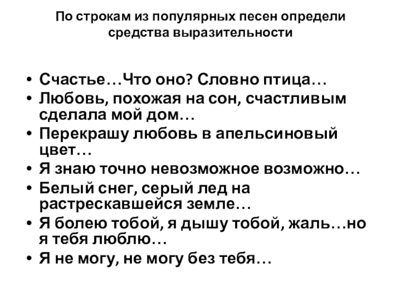 Слайд 5По строкам из популярных песен определи средства выразительности