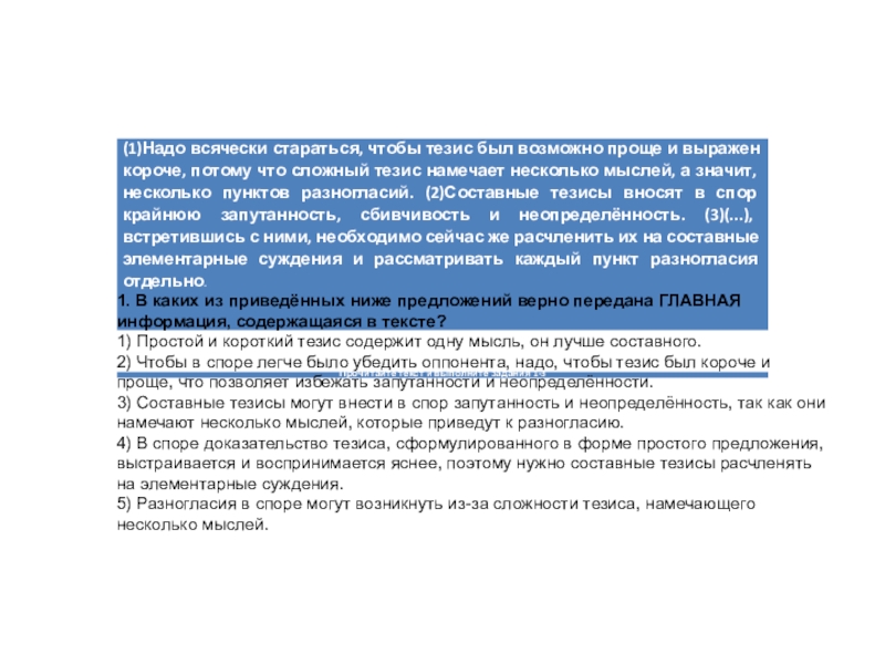 2) Чтобы в споре легче было убедить оппонента, надо, чтобы тезис был короче и проще, что позволяет избежать запутанности и неопределённости.